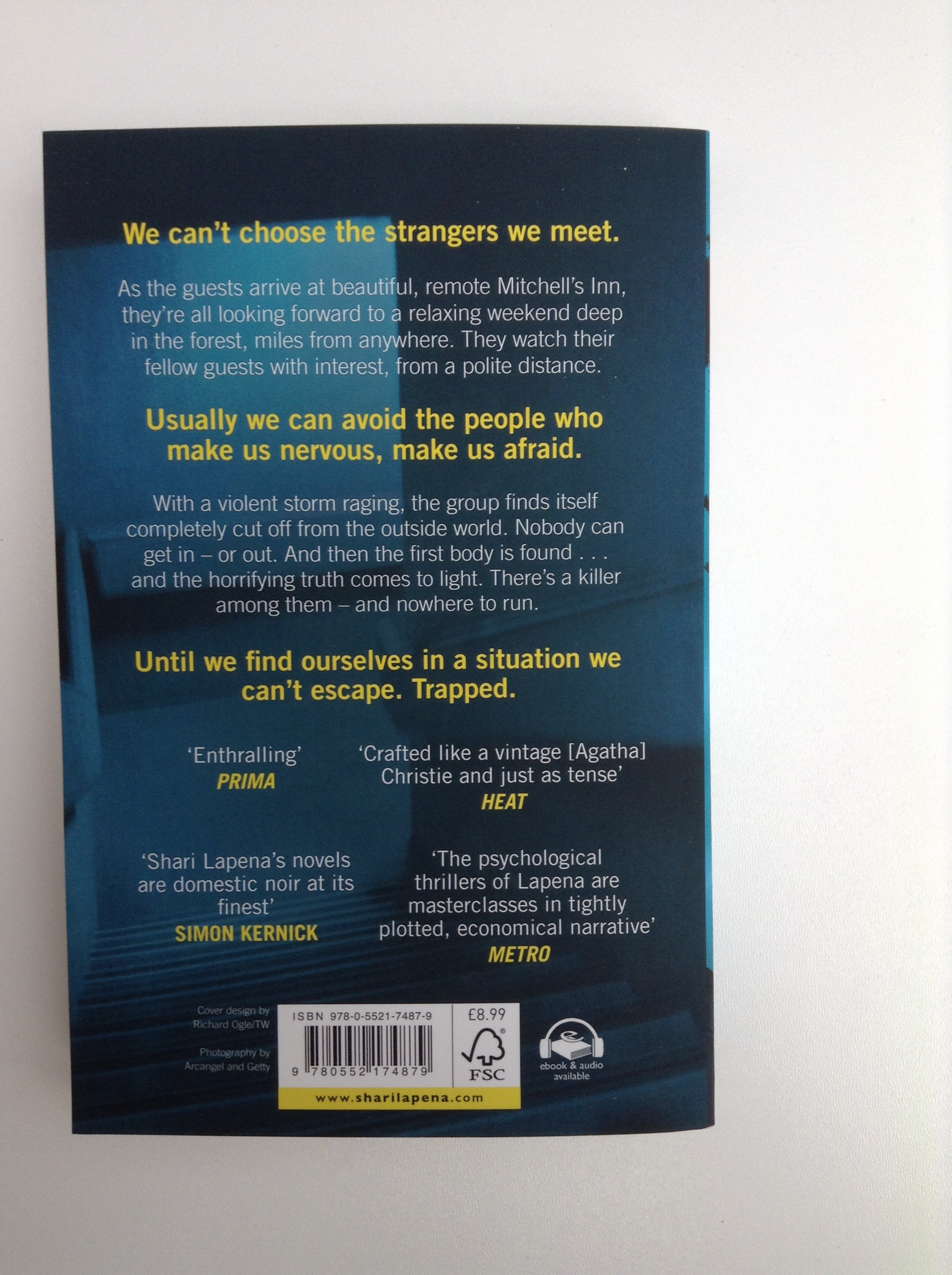 Shari Lapena has done it again with another fast paced thriller, it’s combined like a Christie-Esque. To me the thriller was rather like cluedo, a whodunnit, only here we have couples and with a killer among them. And frightened guest can leave because of the snow. And no police can reach Mitchell’s Inn until the snow storm stops.