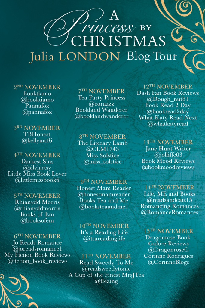 I had read The Princess Plan by Julia London but missed the second book A Royal Kiss and Tell, so when I was asked if I would like to review A Princess By Christmas I was pleased to be able to read the third book . The cover is absolutely gorgeous with the lady in an elegant green dress that seems to be clinched in at the waist. Also on the cover I adore the hair up with a few curls hanging down framing her beautiful face on the lady who must be widow Hollis Honeycutt.