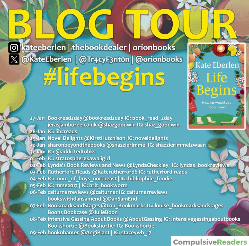 Life Begins at forty, is a twisted story, with plenty of secrets, maybe there’s a lie or two from all the cast of wonderful main characters, oh! come to think of it I’m not so sure the characters were wonderful in their ways. For me the story digs deeper, with in question, do you really know your husband and do you really know your wife. The deal is if Robin and Jessica haven’t found anyone to marry when they reach forty they will marry each other. Sounds perfect, what could go wrong. Years later Laura, and Robin are married with two beautiful children, Ellis and George. While Laura is working as a head teacher, she recklessly has an affair with a music, drama teacher. For Jessica, when she was eighteen it was love at first sight, she had loved her rich, posh beautiful boyish, Robin since university. Years later, Jessica has arranged for her best friend, Robin a special surprise fortieth birthday treat with family and friends to Italy. Unfortunately Robin doesn’t like surprises. Well Robin may not like surprises, but readers most certainly do. I definitely recommend reading Life Begins by Kate Eberlen, who seems to know how to entertain her audience piling on secrets and surprises. Thank you Compulsive blog tours for sending me my lovely copy 🩷