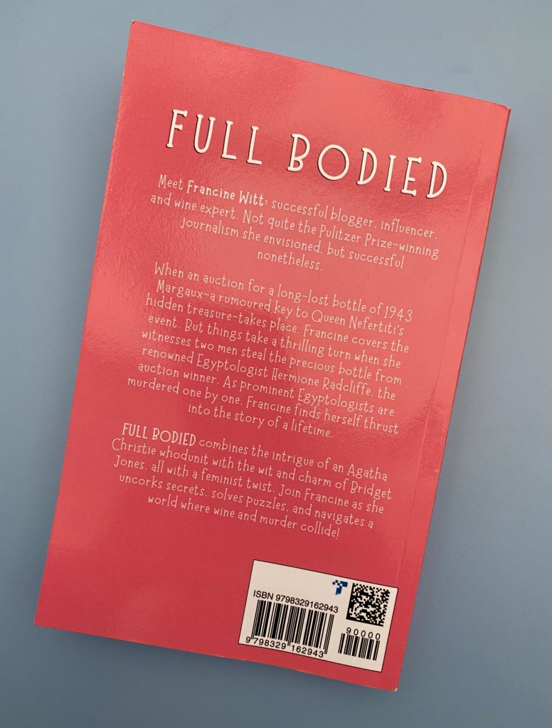 Meet Francine Witt: successful blogger, influencer, and wine expert. Not quite the Pulitzer Prize-winning journalism she envisioned, but successfulnonetheless. When an auction for a long-lost bottle of 1943 Margaux—a rumoured key to Queen Nefertiti’s hidden treasure—takes place, Francine covers the event. But things take a thrilling turn when she witnesses two men steal the precious bottle from renowned Egyptologist Hermione Radcliffe, the auction winner. As prominent Egyptologists are murdered one by one, Francine finds herself thrust into the story of a lifetime. FULL BODIED combines the intrigue of an Agatha Christie whodunit with the wit and charm of Bridget Jones, all with a feminist twist. Join Francine as she uncorks secrets, solves puzzles, and navigates a world where wine and murder collide!