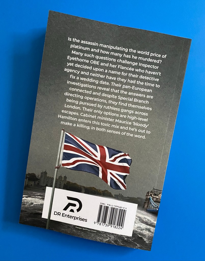 Is the assassin manipulating the world price of platinum and how many has he murdered? Many such questions challenge Inspector Eyethorne OBE and her fiancée who haven’t yet decided upon a name for their detective agency and neither have they had the time to fix a wedding date. Their Pan-European investigations reveal the answers are connected and despite Special Branch directing operations, they find themselves being pursued by ruthless gangs across London. Their only options are high-level escapes . Cabinet minister Maurice bloody Hamilton enters this toxic mix and he’s out to make a killing, in both senses of the world.